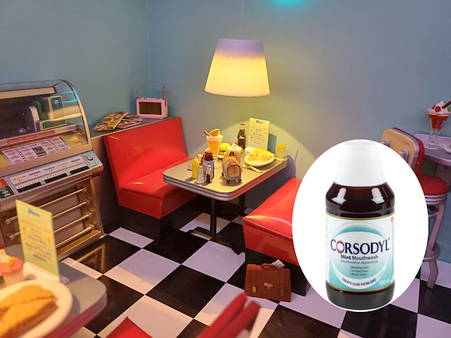 The one thing I really struggled with and couldn’t find anywhere were suitable lampshades. A lot of dolls house lighting tends to be very traditional and that wouldn’t have been right for the diner. Cue the whole family heading out to buy bottles of Corsodyl mouthwash so we could use the lids as lampshades.